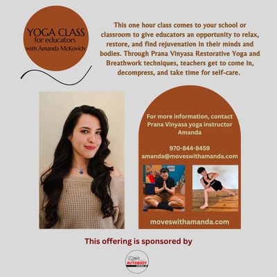 Now it is part of my life's work to teach educators how to access the same type of relief. In this mobile offering, I visit classrooms and schools to give teachers the reset they need in their bodies and mind. Using my training in Yoga and breath work techniques, I guide educators through physical practices that are geared toward a regulated nervous system. This class will leave teachers feeling refreshed and equipped to handle anything that comes their way at school and in life.